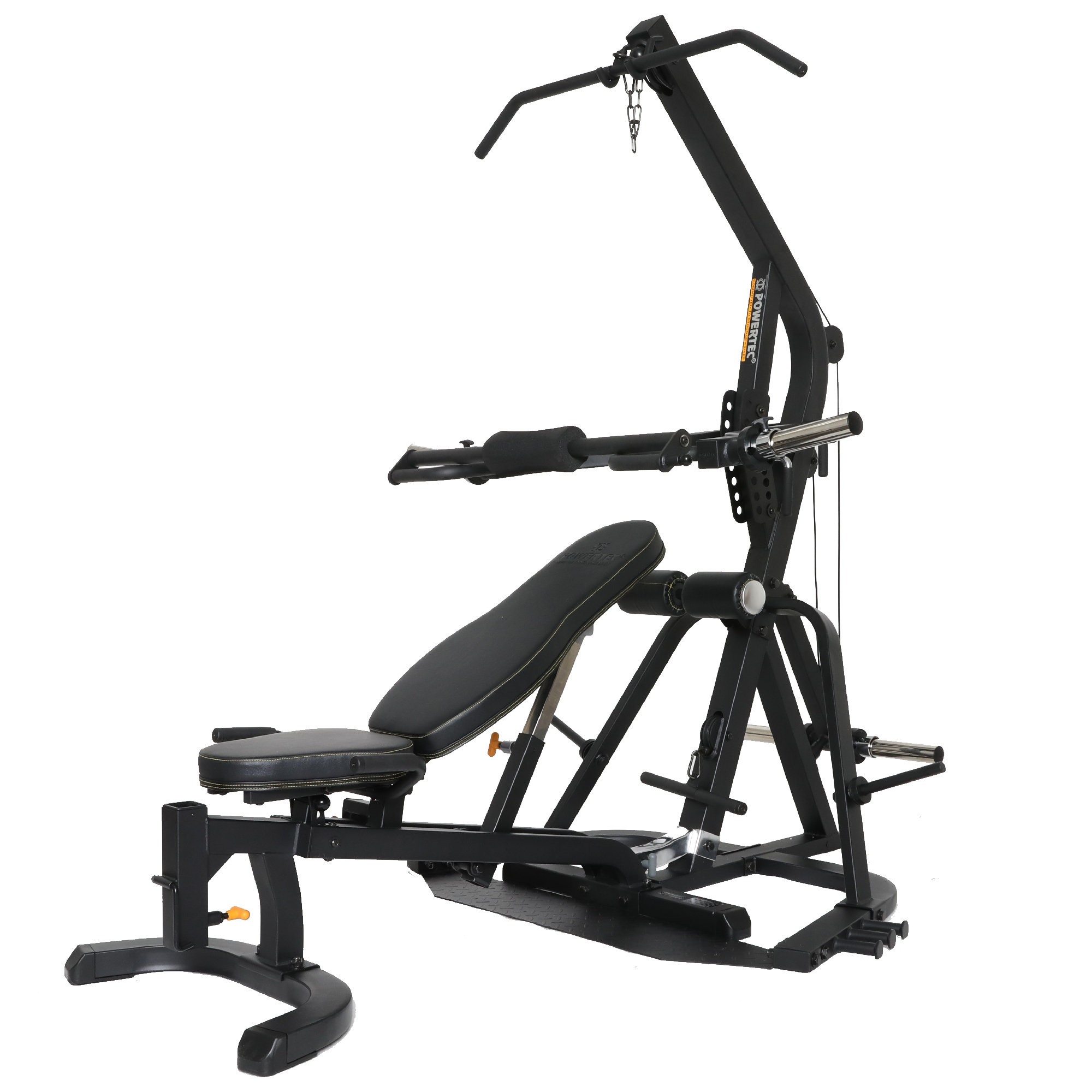 The bench includes the front tube adaptor that accepts all Powertec Workbench Attachments. (The Workbench Levergym® comes with a Lat Pulldown bar, Short Triceps Bar, Extension Chain, Single Handle, and Squat Bar (the connects to the Leverarms).